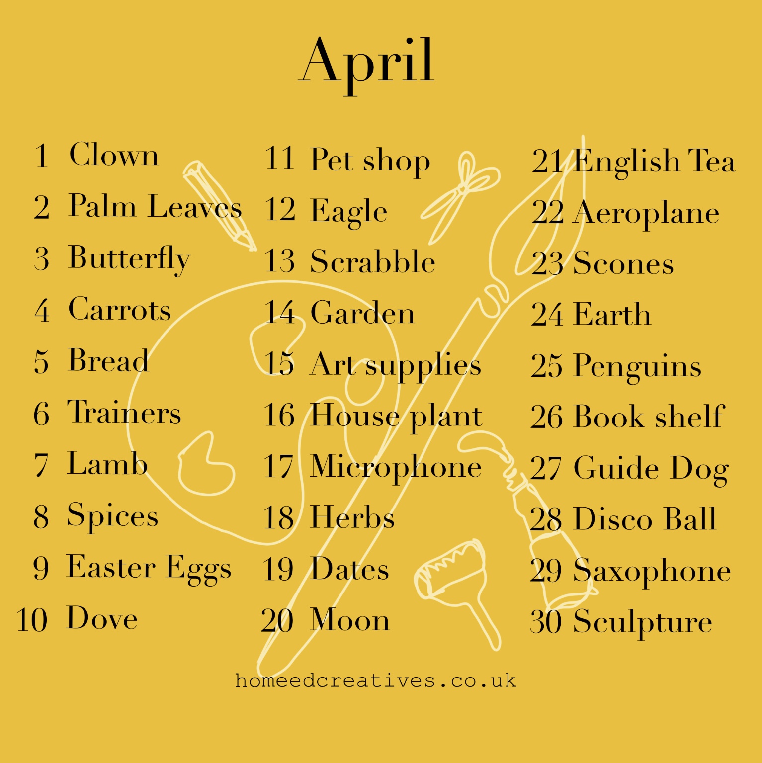 April seems to have many special days – Easter, Eid al-Fitr, Earth Day, as well as World Art Day; just to name a few. Have a look at Calendarr for a complete list. I have taken inspiration from the site for this month’s Drawing Prompts.