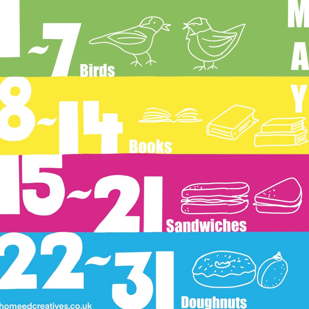 International Dawn Chorus Day is on 7th May where ‘nature’s great symphony’ is celebrated. How about researching about the birds you hear in your area and spend time sketching/painting/make a Collage of them.